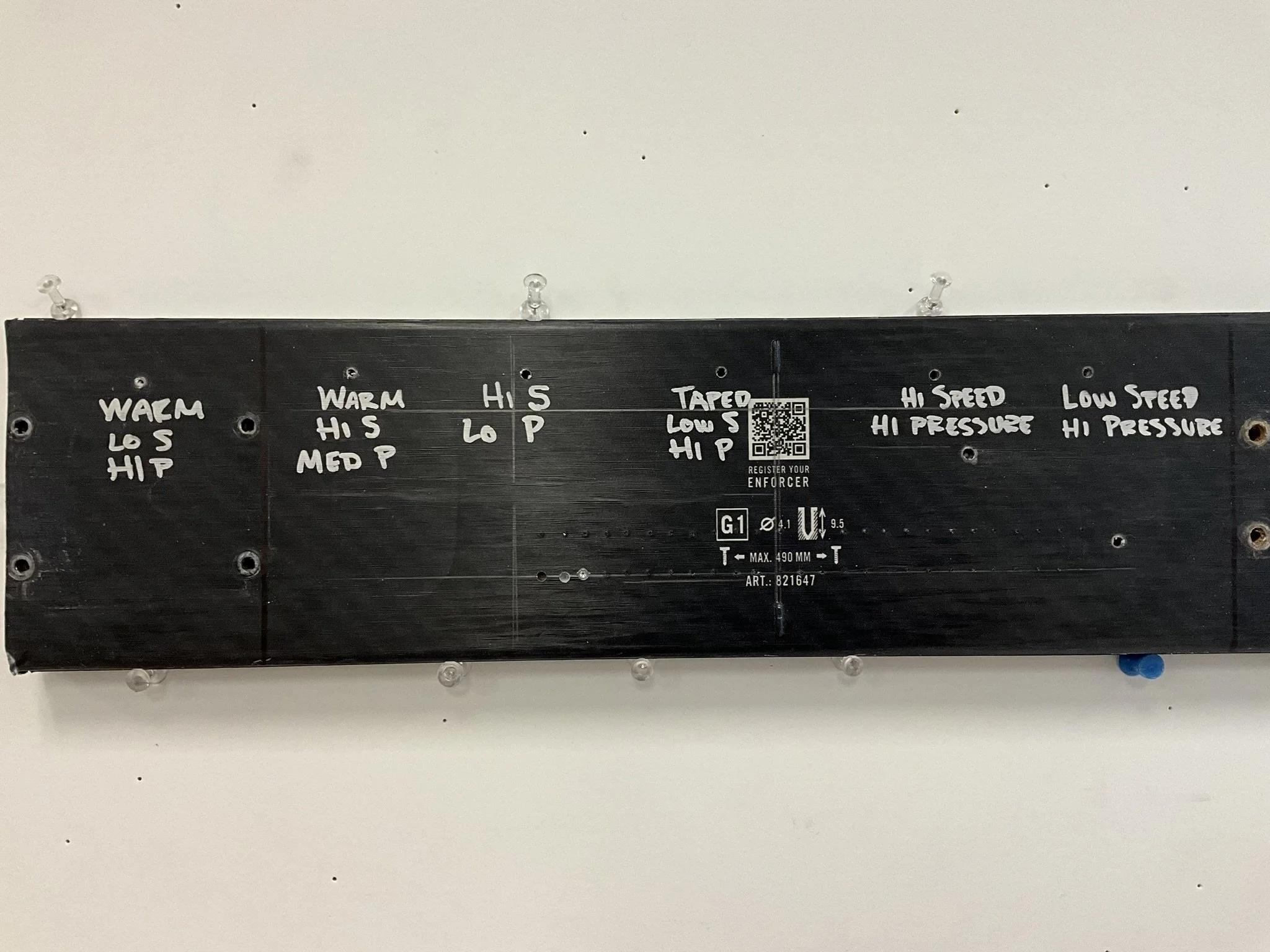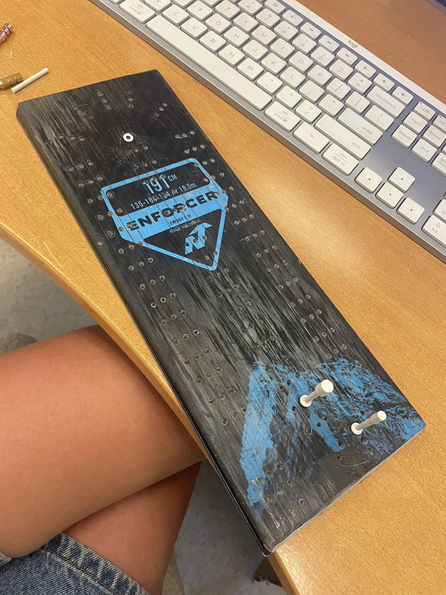 A prototype was rough-cut and hand-drilled to learn about the ski’s material properties.